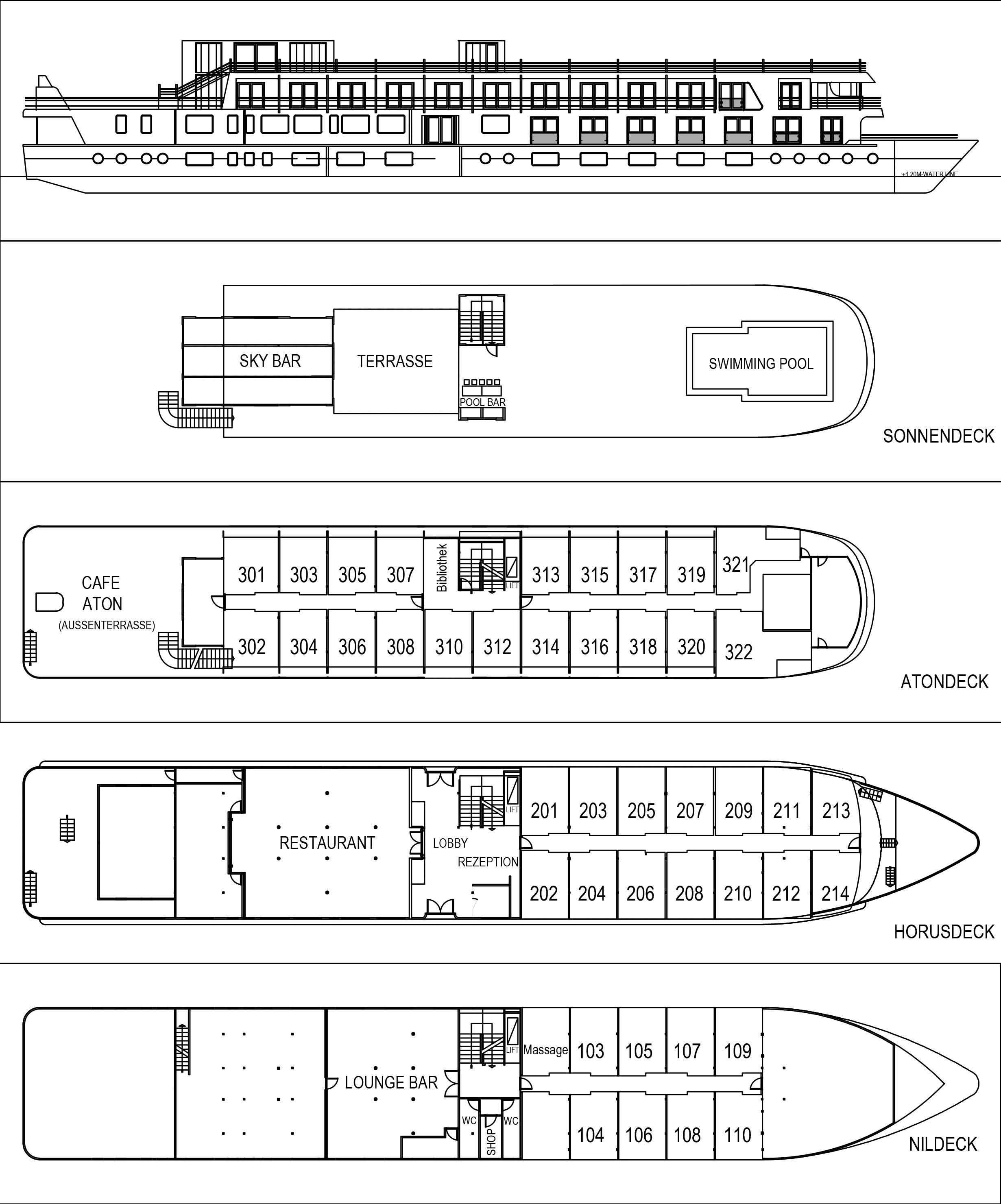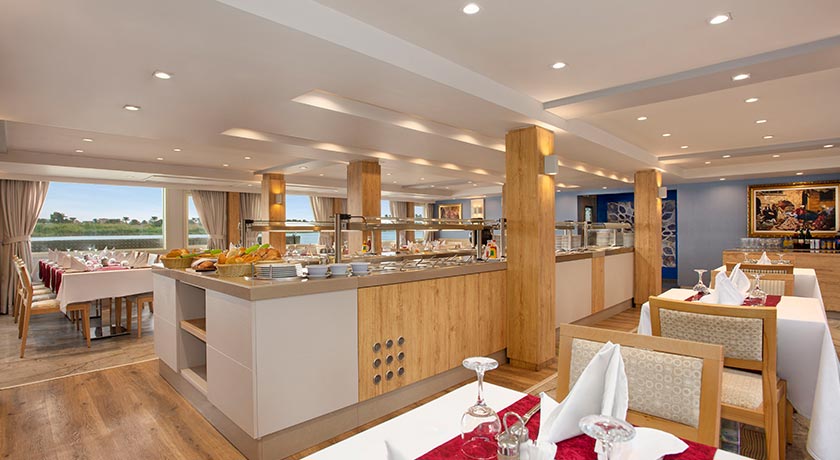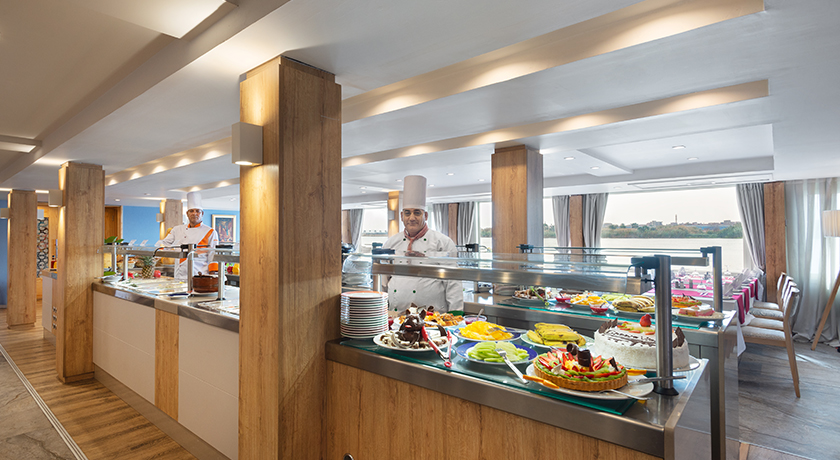 Restaurant Non-smoking restaurant is located in the main deck "Hours Deck" it opens in meals time, Food is served in Buffet, Fully air condtion with wide panoramic sealed window possibility to open