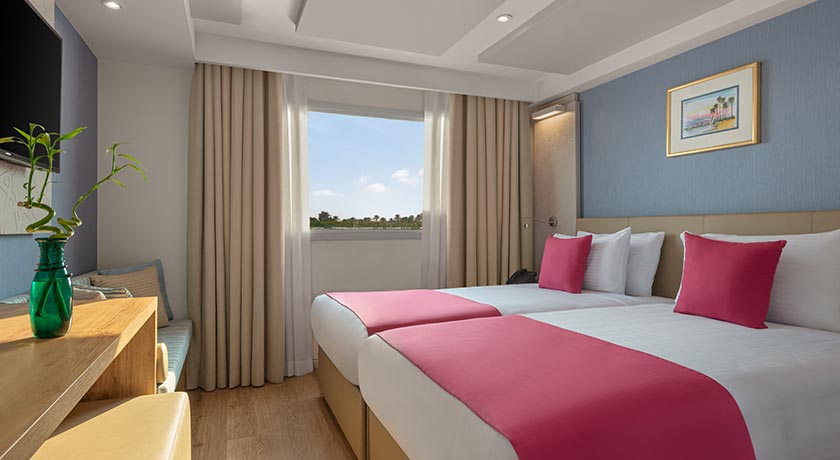 Sealed windows, phones with external lines through operator, fire alarm, color TV, Satellite , and internal information channel (Nile Show)